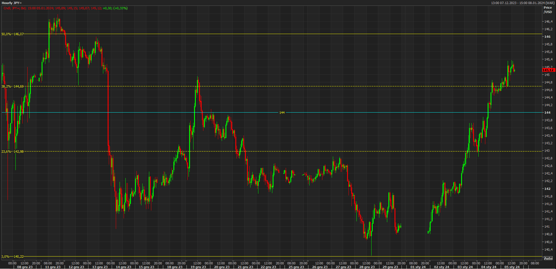 Dla umocnienia dolara celem jest 146,0, tuż powyżej którego jest zniesienie 50,0%. Lepsze NFP od prognoz powinno nam zrzucić dolara amerykańskiego wycenianego w jenach na okolice 144,0, z łatwością przebijając poziom 144,69 czyli zniesienie 38,2%.