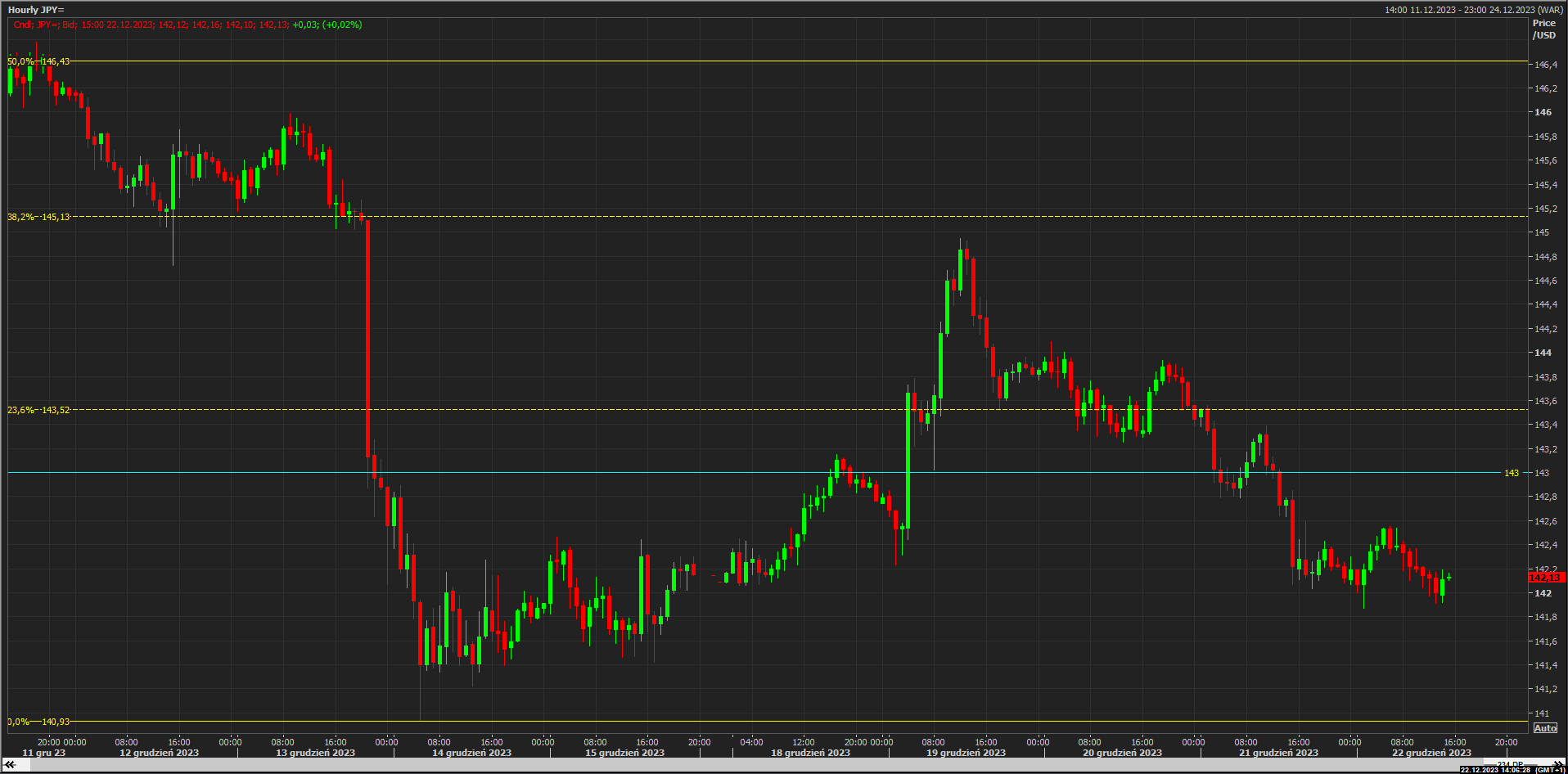 Osobiście, jak większość chyba świata, uważam, że ostatnie wypowiedzi Powella sugerują zakończenie podwyżek stóp procentowych, a skoro są one jakoś 2 punkty procentowe wyższe od PCE, to wypadałoby je obniżać. Jako, że podejrzewam, że PCE jest już opanowane w USA, to niespodzianką zgodną z moimi poglądami byłby odczyt nie wyższy niż bazowe PCE roczne maksymalnie +3,3% r/r. Gdyby tak się stało, to wykres godzinowy (H1) dla USD/JPY miałby otwartą drogę na dołek z 14 grudnia czyli 141,0!