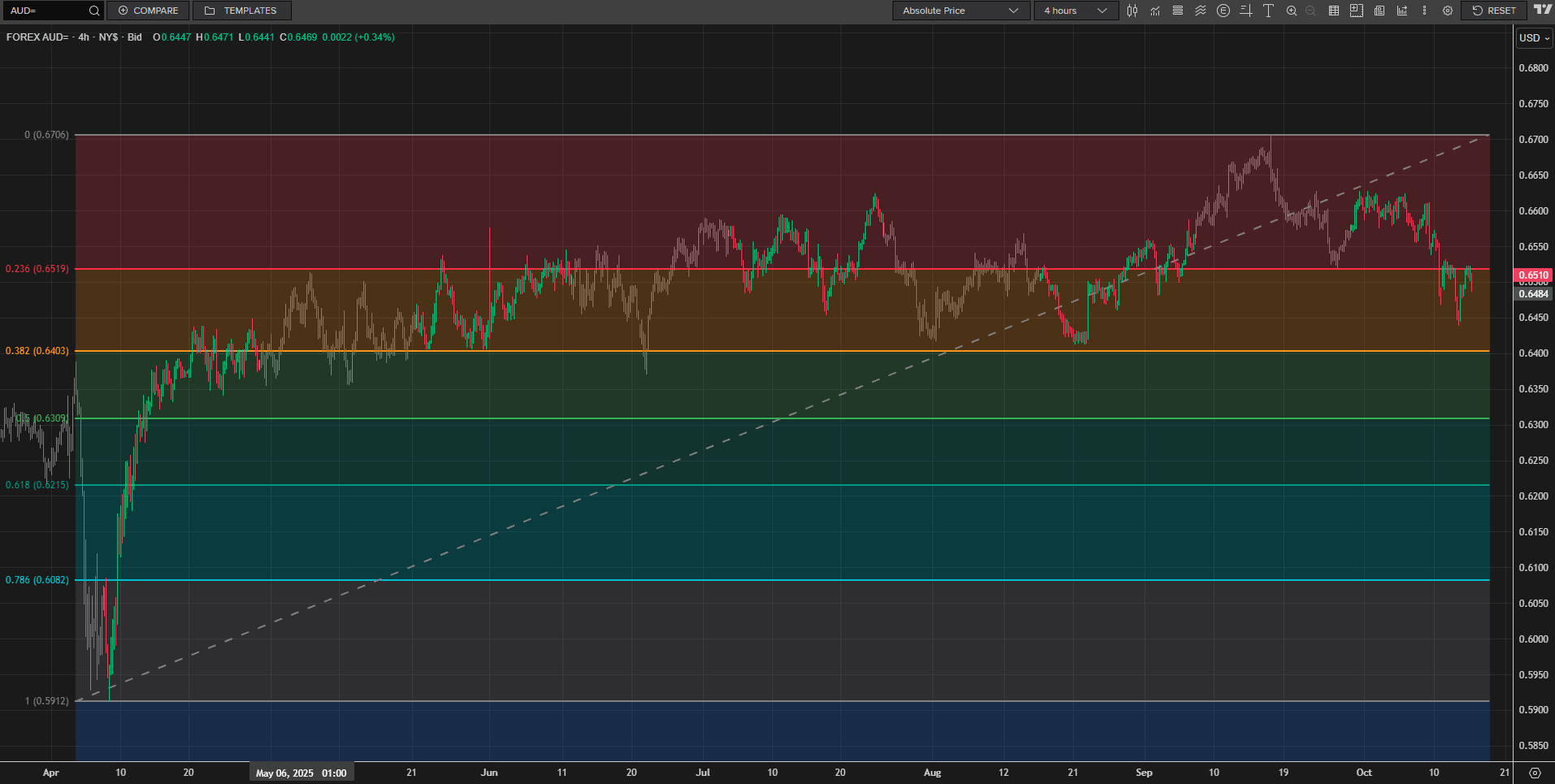 Aktualnie wycena AUDUSD jest w okolicy 0,65. Jednak na interwale czterogodzinowym (H4) widać całkiem ciekawe punkty do „zaczepienia” zniesień Fibonacciego: dołek 8 kwietnia 2025 (0,5912) oraz szczyt 17 września 2025 (0,6706) – oznaczyłem to na pierwszym wykresie widocznym z boku.